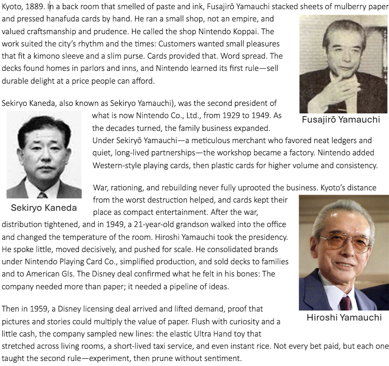 Look back and the story keeps a consistent cast: a founder who trusted small, well-made pleasures; a steward who kept the books clean and the factory upright; and a successor who pushed the company to reinvent its medium every decade. The details changed—paper to plastic to silicon to parks—but the survival kit stayed familiar. Sell delight people can afford. Move before the market demands it. Hold the line on quality even when parts grow scarce. Kyoto gave Nintendo a quiet perch; leadership gave it the nerve to pivot; players gave it the reason to endure. From a single room of hand-pressed cards to handhelds, consoles, and shared worlds, Nintendo kept dealing the next hand before the table went cold.