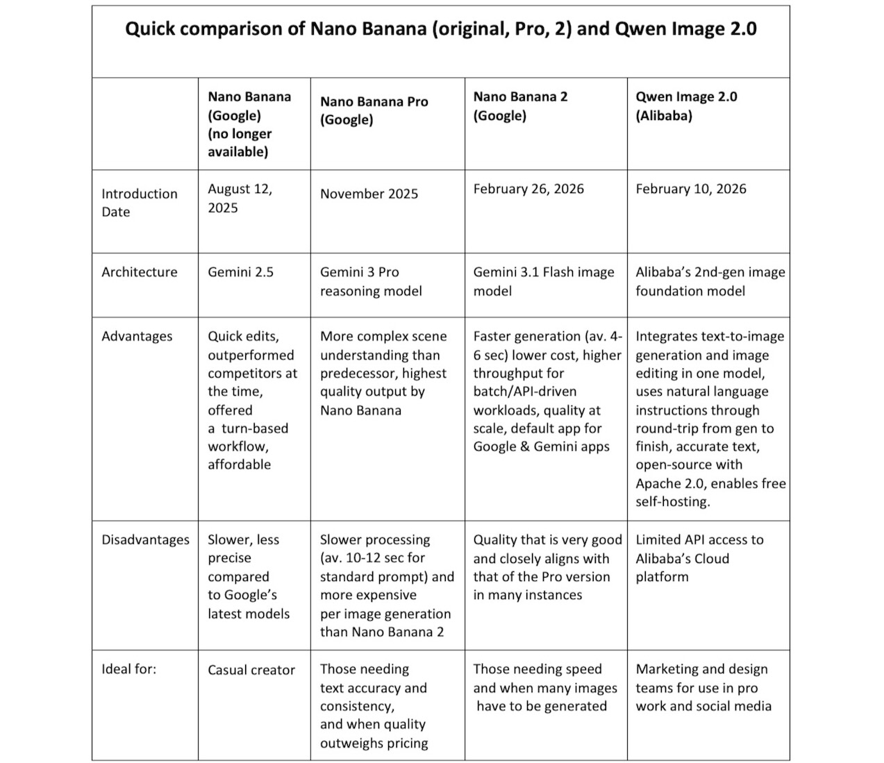 The rise of AI image generators has occurred recently and has progressed swiftly. In August 2025, Google’s Nano Banana was released, followed three months later by a Pro version, aimed at professionals, that produced next-level quality and accuracy—but at a premium price compared to the initial version for the more casual user. Alibaba challenged Nano Banana Pro with its Qwen Image 2.0, with similar features and a lower price per image. Google countered, not by messing with its Nano Banana Pro delivering top-quality images, but with the new Nano Banana 2.0, which produced images of slightly less quality than its Pro version but faster and cheaper.