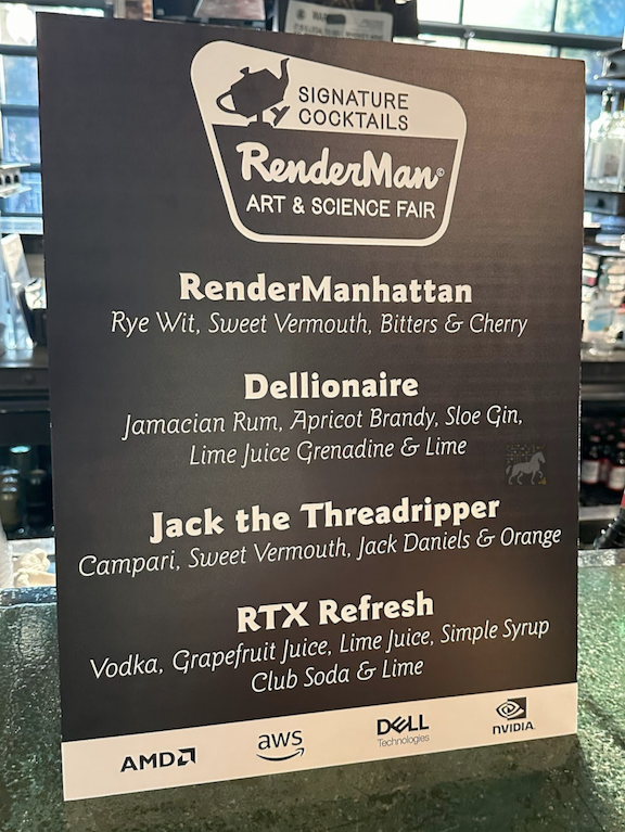 Cocktail menu at Pixar’s RenderMan Art & Science Fair at Siggraph 2024.