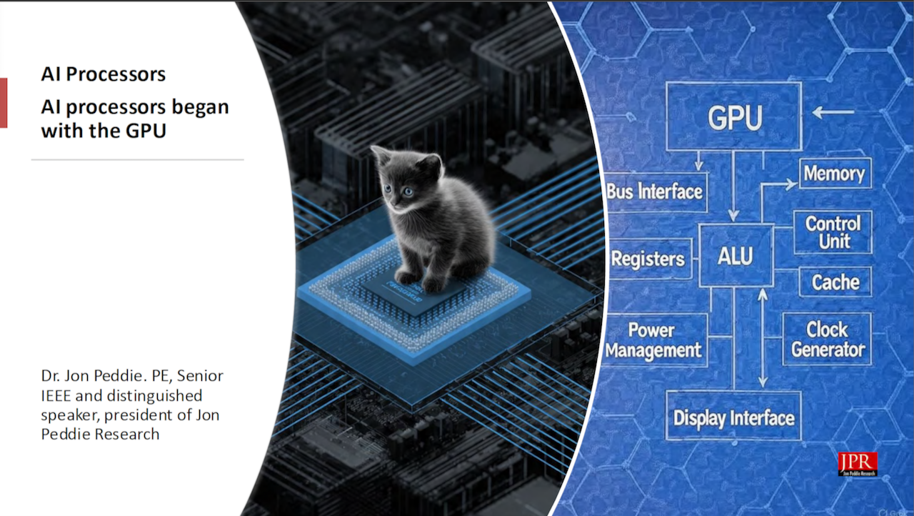 Jon Peddie Research’s AI Processor Summary provides a condensed, easy-to-digest introductory summary of AI processors—their origin as GPUs, how and why they evolved, and the subsequent explosion of the AI processor (AIP) market. The report also delves into the population explosion of AIP companies, the types of AI processors, what the NPU brings to the table, and more.